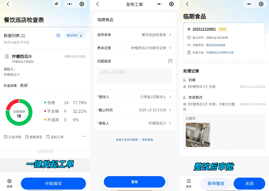 企鲸的工单功能是处理 “查抄走过场” 的环节。督导发觉问题(好比临期食材未隔离),可间接正在查抄单上 “倡议工单”,要求店长几小时内处置→店长整改后摄影反馈→督导手机确认整改,工单封闭。