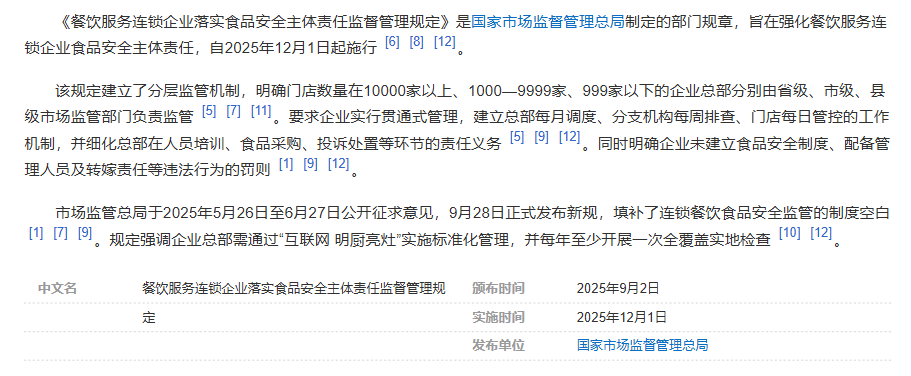 近日,国度市场监管总局发布《餐饮办事连锁企业落实食物平安从体义务监视办理》,明白 2025 年 12 月 1 日起正式施行。