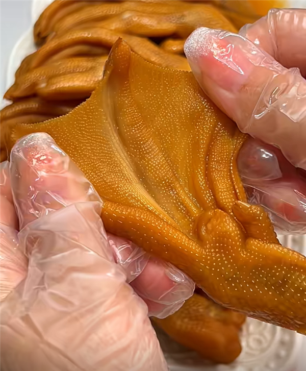 对于需要控血压的人群来说,同样的烹饪体例下,和鸡爪比拟,选择鸭掌对维持血压健康更为敌对一些。正在其他养分成分上,鸡爪的钾含量、硒含量较着高于鸭掌,别离是鸭掌的 4 倍、1。8 倍。[1]网上曾报道过有一些不良商贩利用过氧化氢对鸡爪、鸭掌等进行漂白,是由于添加过氧化氢不只能杀菌耽误保质期,还能去除鸡爪、鸭掌经煮制残留的血渍、污溃,也能去除爪子本身的微,使鸡爪、鸭掌显得又白又大。可是颠末过氧化氢溶液浸泡后的鸡爪和鸭掌,不只养分成分会遭到,还会对健康发生风险,毁伤胃黏膜。[2]按照我国 GB 2760-2024《食物添加剂利用尺度》,不答应利用过氧化氢漂白鸡爪、鸭掌,只答应利用正在某些特定的加工环节中。优良鸭掌弹性好,按压后能快速回弹,申明鸭掌很新颖。若是摸起来发黏、软烂,捏一下会构成凹陷的坑,弹性很差,那就曾经不新颖了。凡是环境下,泡椒风味的鸡爪和鸭掌盐含量可能更高。好比下图这款泡椒味鸭爪,4~5个鸭掌下肚大约就是 100 克,将会摄入 1488 毫克钠,