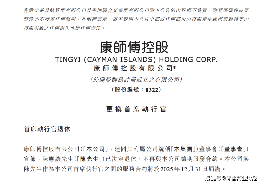 12月18日午间,正在港上市的康师傅控股发出通知布告,颁布发表改换首席施行官。按照放置,现任首席施行官陈应让决定正在2026年退休,43岁的魏宏丞将接任。按照通知布告,康师傅董事会颁布发表,陈应让已决定退休,不再取该公司续签办事合约。他为该公司首席施行官之间的办事合约将于2025年12月31日届满。康师傅董事会向其称谢,指陈应让自2013年2月插手本集团以来,正在培育新一代人才、引进外部合做伙伴、食物平安和手艺平台扶植等范畴取得了显著成绩,为营业成长做出了庞大贡献,帮力本公司积极践行高质量成长。魏宏丞现年43岁,自2019年1月1日起出任康师傅施行董事。他本科结业于伦敦帝国粹院,并获得哈佛商学院工商办理硕士学位。他还担任哈佛商学院院长参谋委员会,康师傅指其正在财产趋向取组织带领力方面看法深刻。